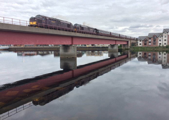 37516 and 37685 crossing Ness Bridge in Inverness, heading from Keith to Kyle of Lochalsh on Day 2 of the Royal Scotsman Classic Tour, 15 June 2014.