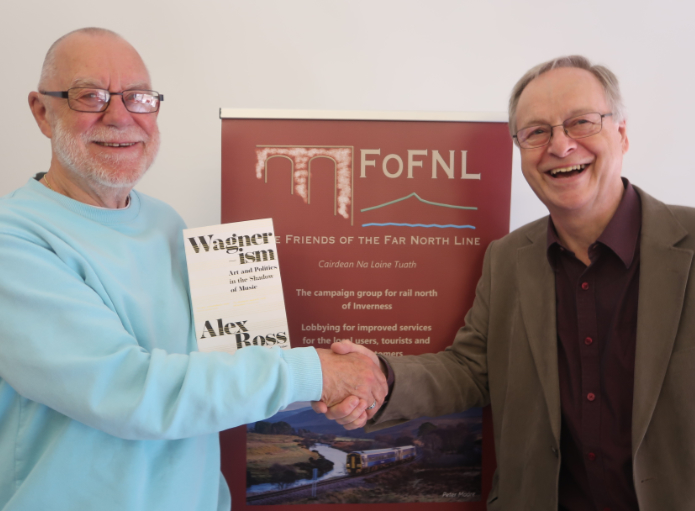 The AGM covered the usual business matters but also marked the end of Mike Lunan's 18 years as a committee member, many as Convener. Mike's contribution has been very significant and we wanted to show our appreciation by making a presentation. A book seemed most appropriate - but not a railway book - we thought he would have lots of those already. Knowing Mike's extensive interest in music, and especially his enjoyment of Wagner operas, we found a book about the great composer and his rather controversial politics. This should take Mike's mind off worrying about the FNL, at least for a while!